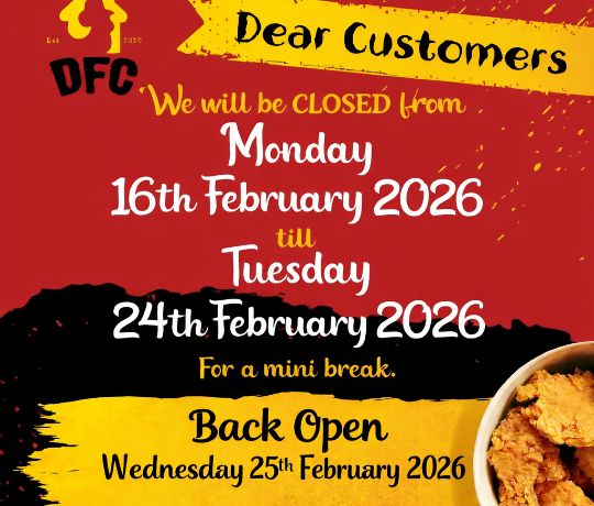 We are OPEN 6 days a week, from 4:30pm till 10:30pm - Friday & Saturday till 11:30pm ***************** DFC BREAKFAST - served daily from 9:30am till 3pm ***************** DFC DESI SPUDS - served daily from 11am till we sell out